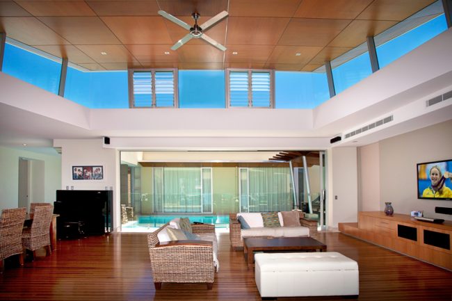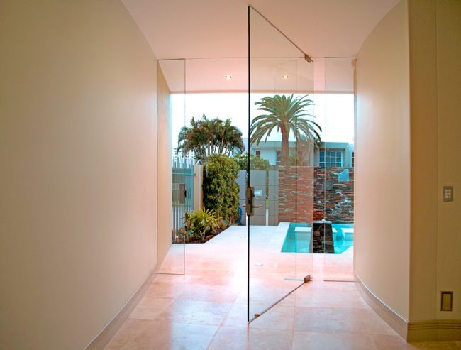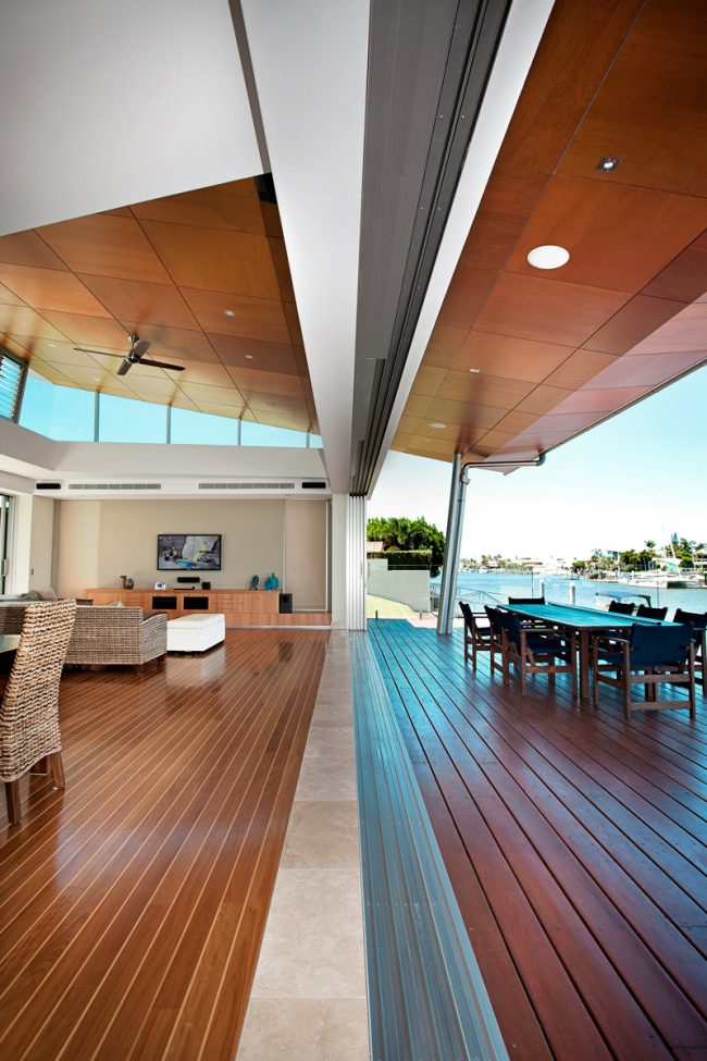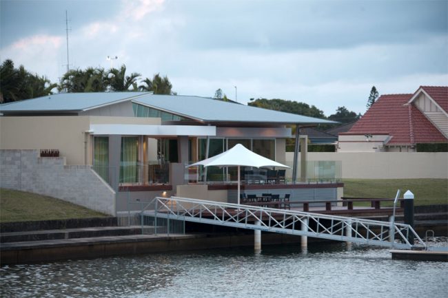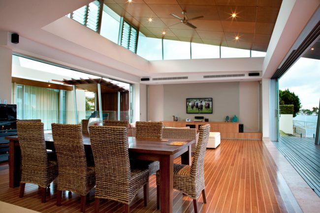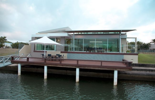 Modern waterfront home with great use of Elevate commercial stacking doors, Vantage louvre windows and frameless glass entrance door.