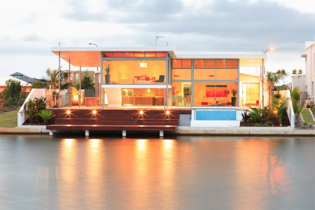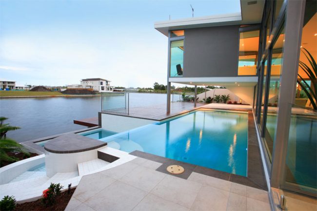 A stunning architectural home at Pelican Waters. The design embraces large glass walls looking out to the water. Elevate commercial systems, Magnum, and some residential suites have been used in this project.